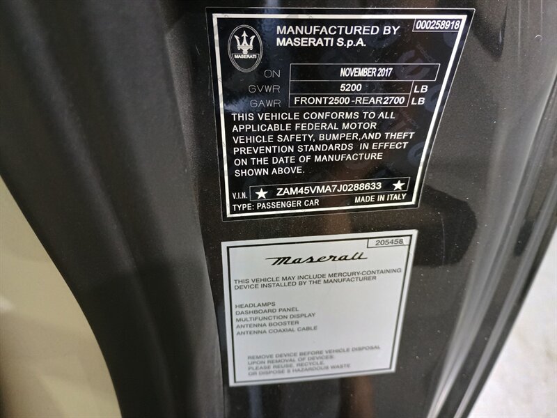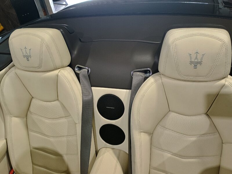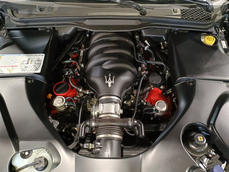 Factory-equipped with sport-tuned suspension and Brembo performance brakes, 2+2 coupe body, handcrafted full-grain leather interior with bolstered power-adjustable and heated front sport seats, signature Maserati analog clock, steering-wheel paddle shifters, dual-zone automatic climate control, factory navigation and infotainment with Bluetooth connectivity, premium audio, power windows/locks/mirrors, keyless entry, xenon/bi-xenon headlights with LED daytime running lights, 20-inch alloy wheels, and comprehensive safety systems including ABS, traction and stability control and multiple airbags.