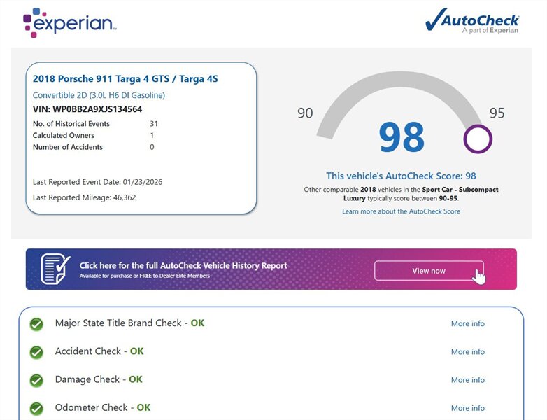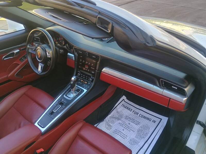 This Super Clean ONE OWNER 2018 Porsche 911 Targa 4S - Powered by the factory 3.0L twin-turbo H6 producing 420 hp and 368 lb-ft, paired with Porsche’s 7-speed PDK and Porsche Traction Management all-wheel drive. Factory equipment includes the signature automatic Targa glass roof and wraparound rear window, Porsche Active Suspension Management (PASM) with adaptive dampers, electromechanical power steering, high-performance ventilated disc brakes with ABS and stability control, dual-zone automatic climate control, Porsche Communication Management (PCM) with navigation, Bluetooth and USB connectivity, power-adjustable heated sport seats finished in Bordeaux Red leather, and a premium interior trim package. Finished in White exterior over Bordeaux Red interior, under 47,000 miles (averaging <6,000 miles/year) and in excellent overall condition.